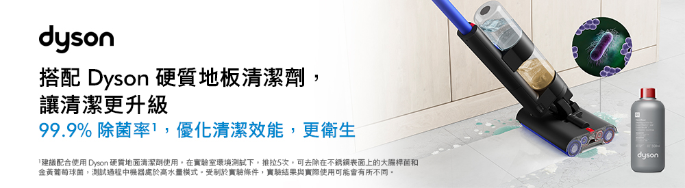 推薦使用dyson硬質地板專用清潔劑,特殊配方低敏無刺激性,可深入隙縫消毒,除菌清潔效果經實驗證實達到99.9%**